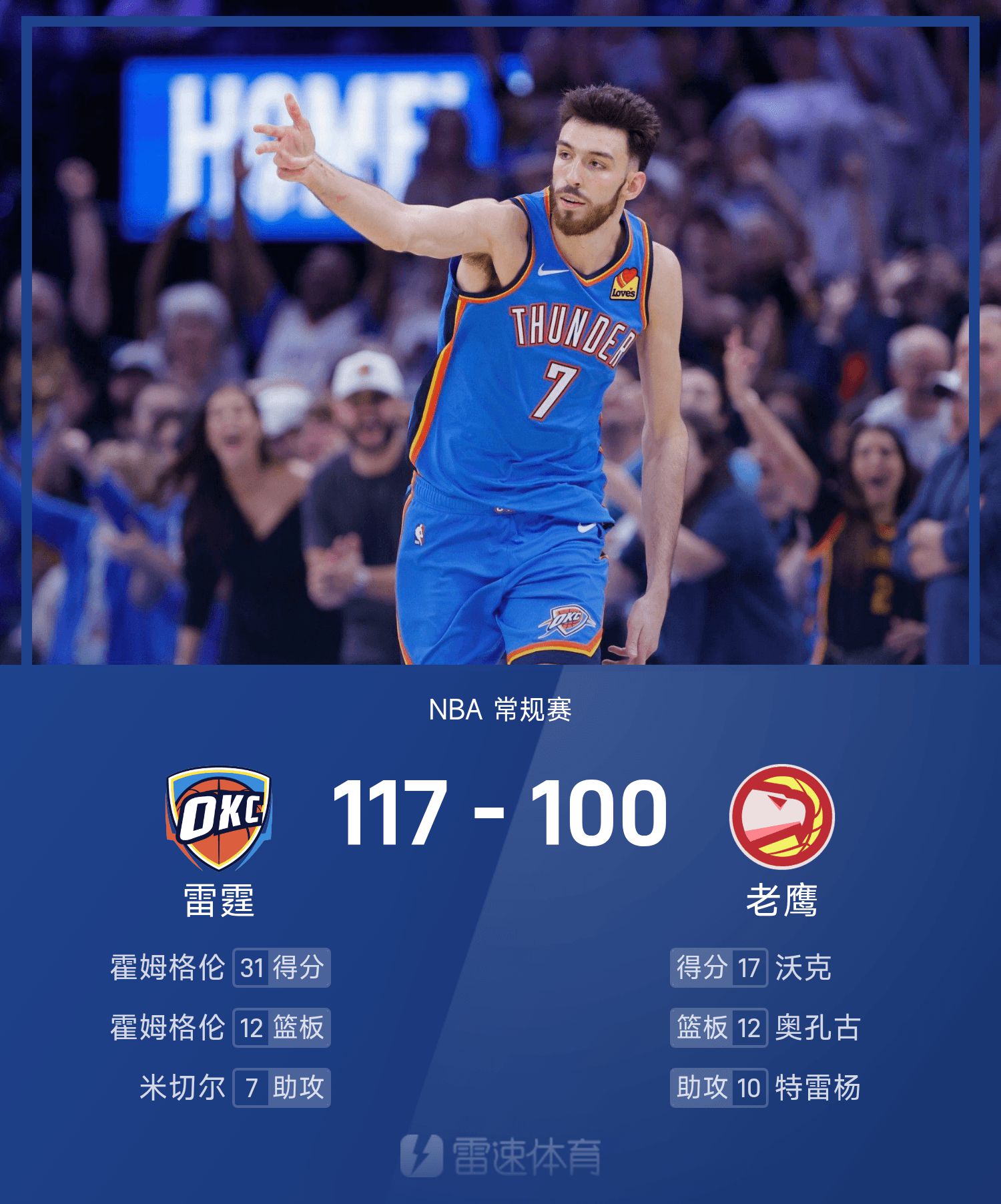 थंडर इनसाइडर चेत होल्मग्रेन ने 6 थ्री-पॉइंटर्स मारे और 31 अंक, 12 रिबाउंड और 3 इंटरसेप्शन बनाए; थंडर कोर अलेक्जेंडर ने केवल 4 फ्री थ्रो के साथ 30 अंक, 4 रिबाउंड और 5 सहायता प्राप्त की। थंडर ने अपने दो सितारों के शानदार प्रदर्शन की बदौलत सीज़न की शुरुआत लगातार तीन जीत के साथ की।