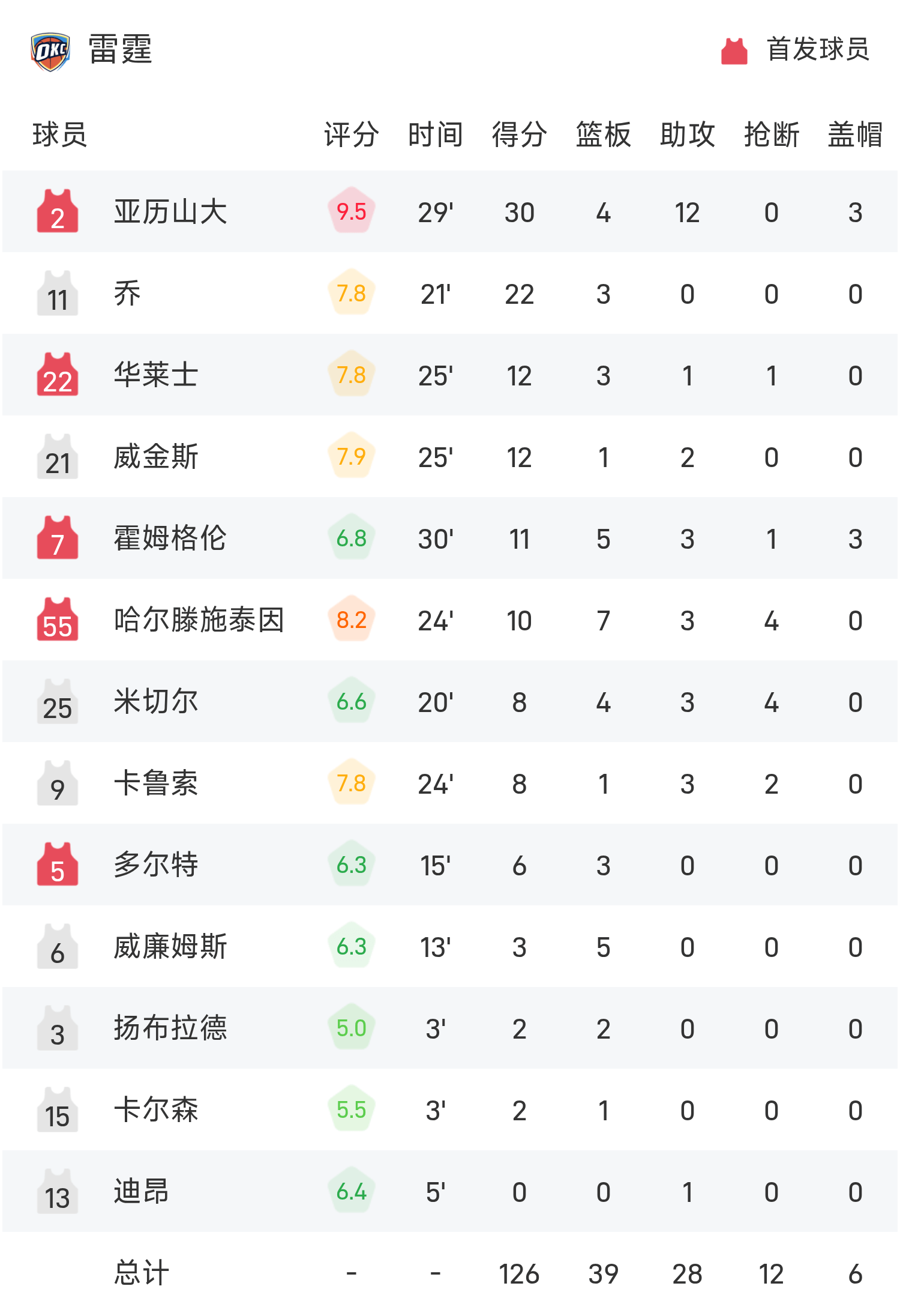 6686 खेल नवंबर 5 समाचार 25/26 एनबीए नियमित सीज़न में, क्लिपर्स ने थंडर के खिलाफ खेला। खेल के अंत में, क्लिपर्स थंडर से 107-126 से हार गए। अलेक्जेंडर ने गेम में सर्वाधिक 30 अंक, 4 रिबाउंड और 12 सहायता अर्जित की, जिससे थंडर जीत की ओर अग्रसर हुआ। सीज़न की शुरुआत करने के लिए थंडर ने लगातार 8 गेम जीते।