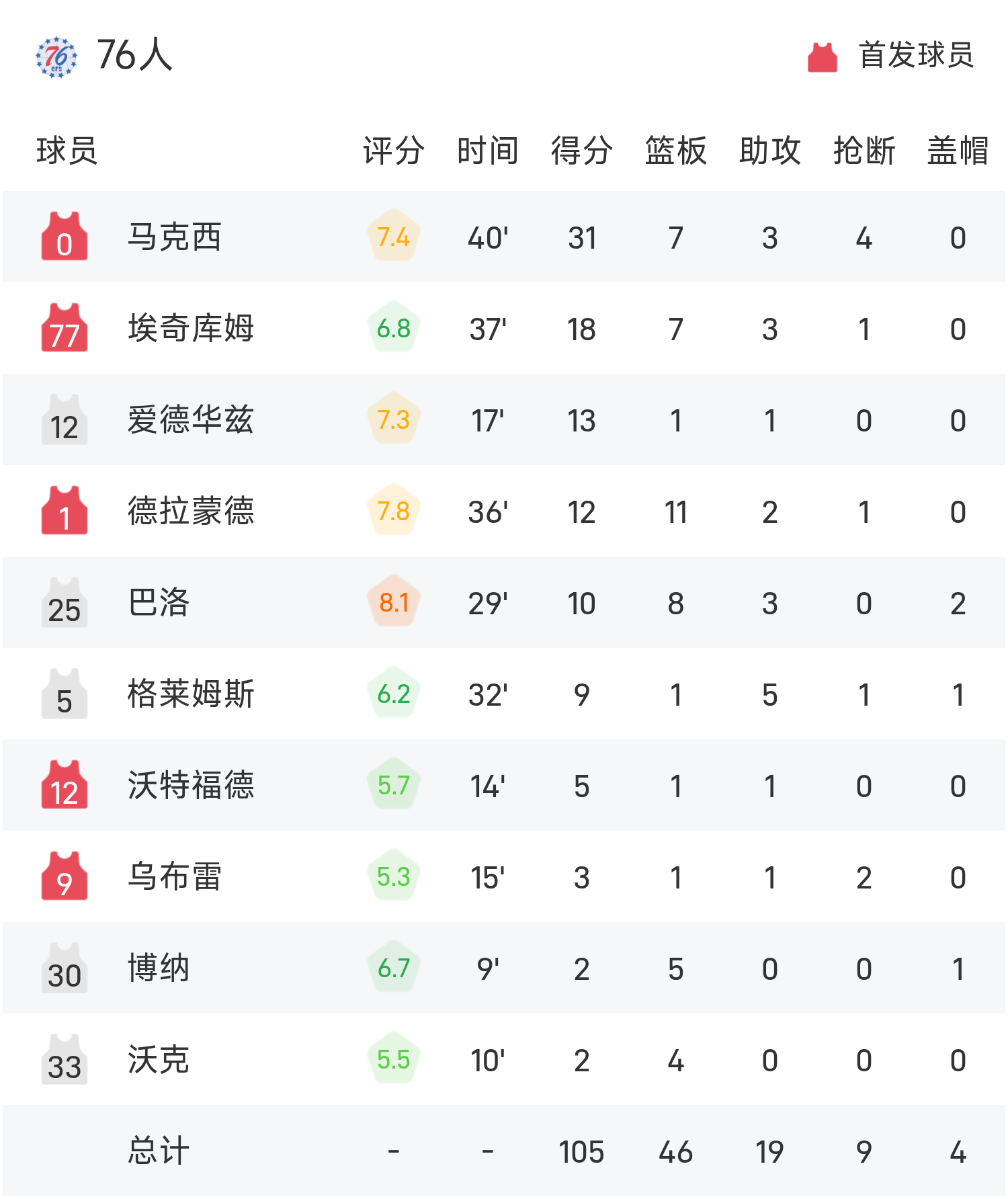 6686 खेल नवंबर 15 समाचार 25/26 NBA नियमित सीज़न NBA कप ग्रुप मैच में, पिस्टन का सामना 76ers से हुआ। खेल के अंत में, पिस्टन ने 76ers को 114-105 से हराया। ग्रीन ने 21 अंक, 9 रिबाउंड और 3 सहायता करके टीम को जीत दिलाई। मैक्सी ने गेम में सर्वाधिक 31 अंक, 7 रिबाउंड और 3 सहायता अर्जित की।