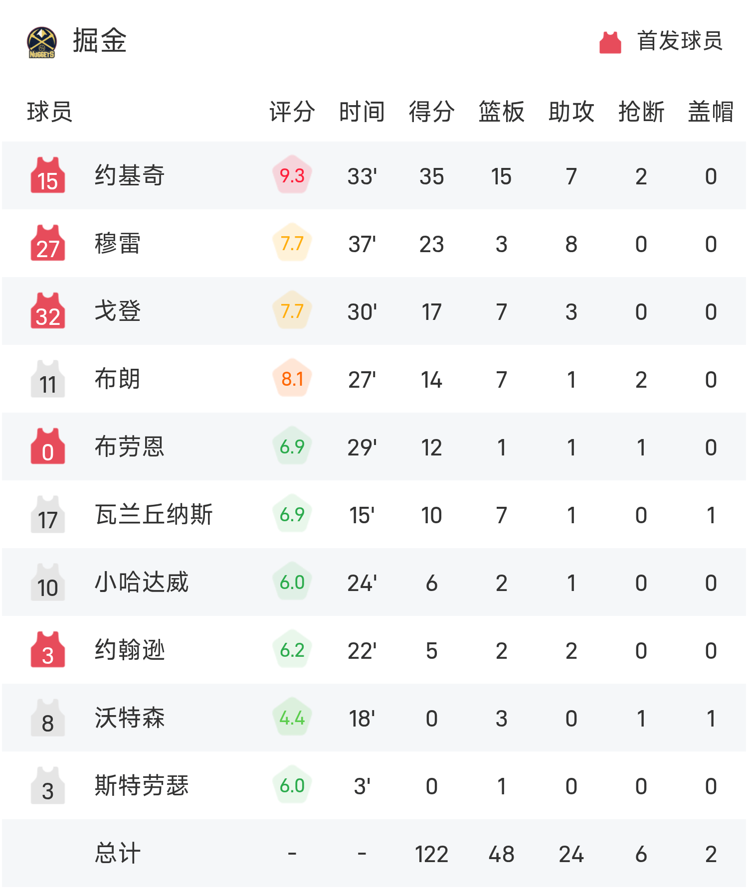जोकिक ने गेम में सर्वाधिक 35 अंक, 15 रिबाउंड और 7 सहायता अर्जित की, जिससे नगेट्स को जीत मिली।