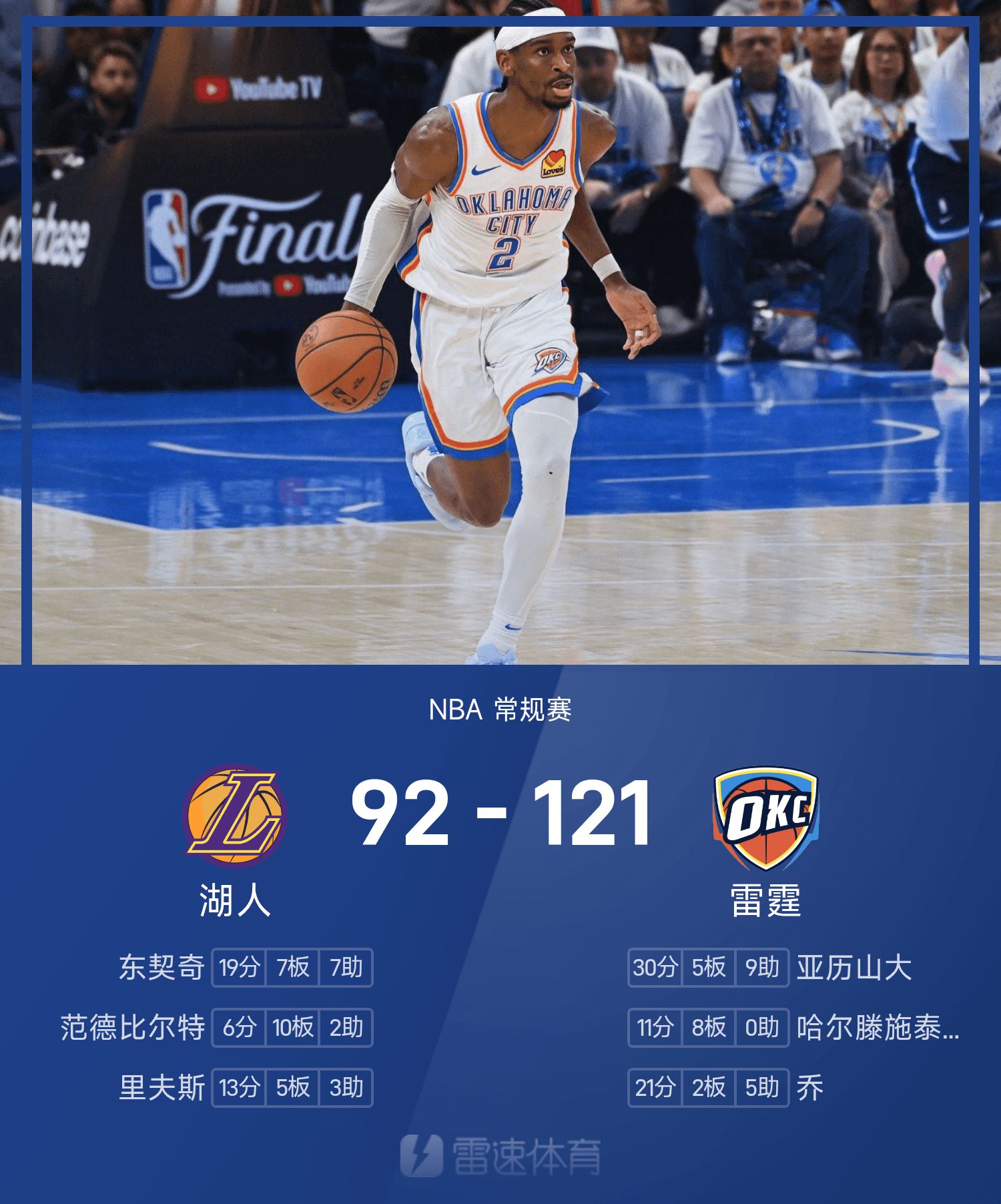 6686 स्पोर्ट्स 13 नवंबर समाचार 25/26 NBA नियमित सीज़न में, थंडर ने लेकर्स का सामना किया। खेल के अंत में थंडर ने लेकर्स को 121-92 से हराया। अलेक्जेंडर ने गेम में सर्वाधिक 30 अंक, 5 रिबाउंड और 9 सहायता अर्जित की, जिससे थंडर को जीत मिली।
