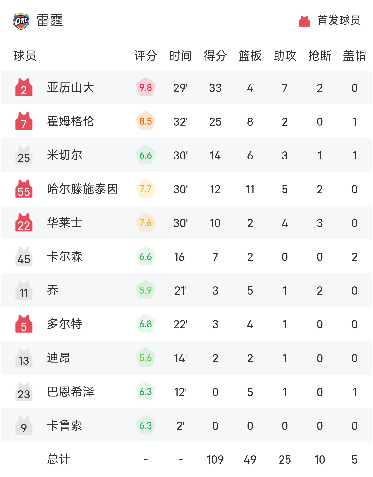 अलेक्जेंडर ने गेम में सर्वाधिक 33 अंक, 4 रिबाउंड और 7 सहायता अर्जित की, जिससे थंडर जीत की ओर अग्रसर हुआ।