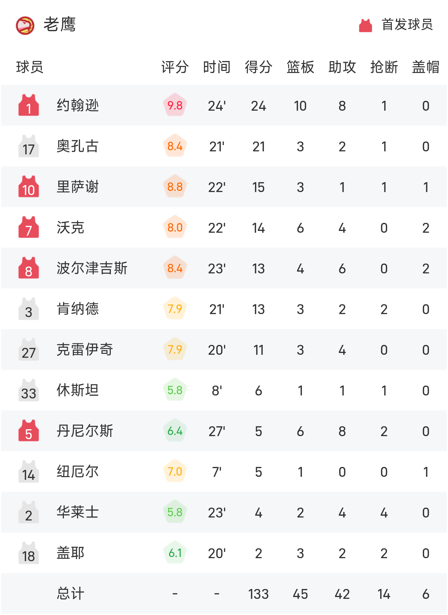 6686 स्पोर्ट्स 13 नवंबर समाचार 25/26 NBA नियमित सीज़न में, किंग्स का सामना हॉक्स से हुआ। खेल के अंत में, किंग्स ईगल्स से 100-133 से हार गए। जॉनसन ने गेम में सर्वाधिक 24 अंक, 10 रिबाउंड और 8 सहायता अर्जित की, जिससे हॉक्स को जीत मिली।