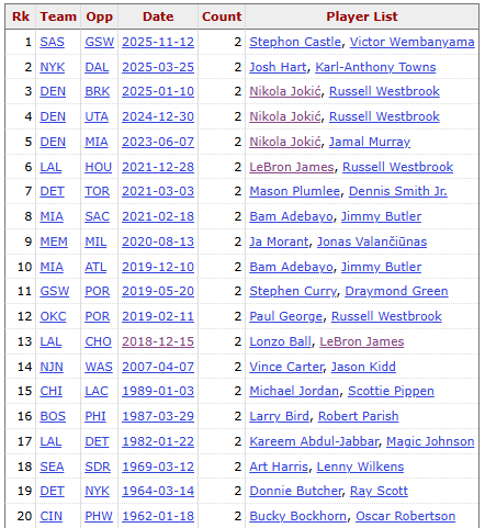 आज के बुन्यामा और कैसल सहित, एनबीए के इतिहास में 20 चमत्कार हुए हैं जहां एक ही टीम के खिलाड़ियों ने एक ही समय में ट्रिपल-डबल्स बनाए। उनमें से, ट्रिपल-डबल किंग वेस्टब्रुक ने सबसे अधिक 4 बार भाग लिया, और जोकिक ने 3 बार भाग लिया, दूसरे स्थान पर रहे। दोनों ने एक ही मैदान पर दो बार ट्रिपल-डबल बनाया और वे इतिहास में एकमात्र जोड़ी हैं। जेम्स उनमें से दो में शामिल था। तीन लोगों को छोड़कर कोई भी अन्य खिलाड़ी इसे एक से अधिक बार नहीं कर सकता।