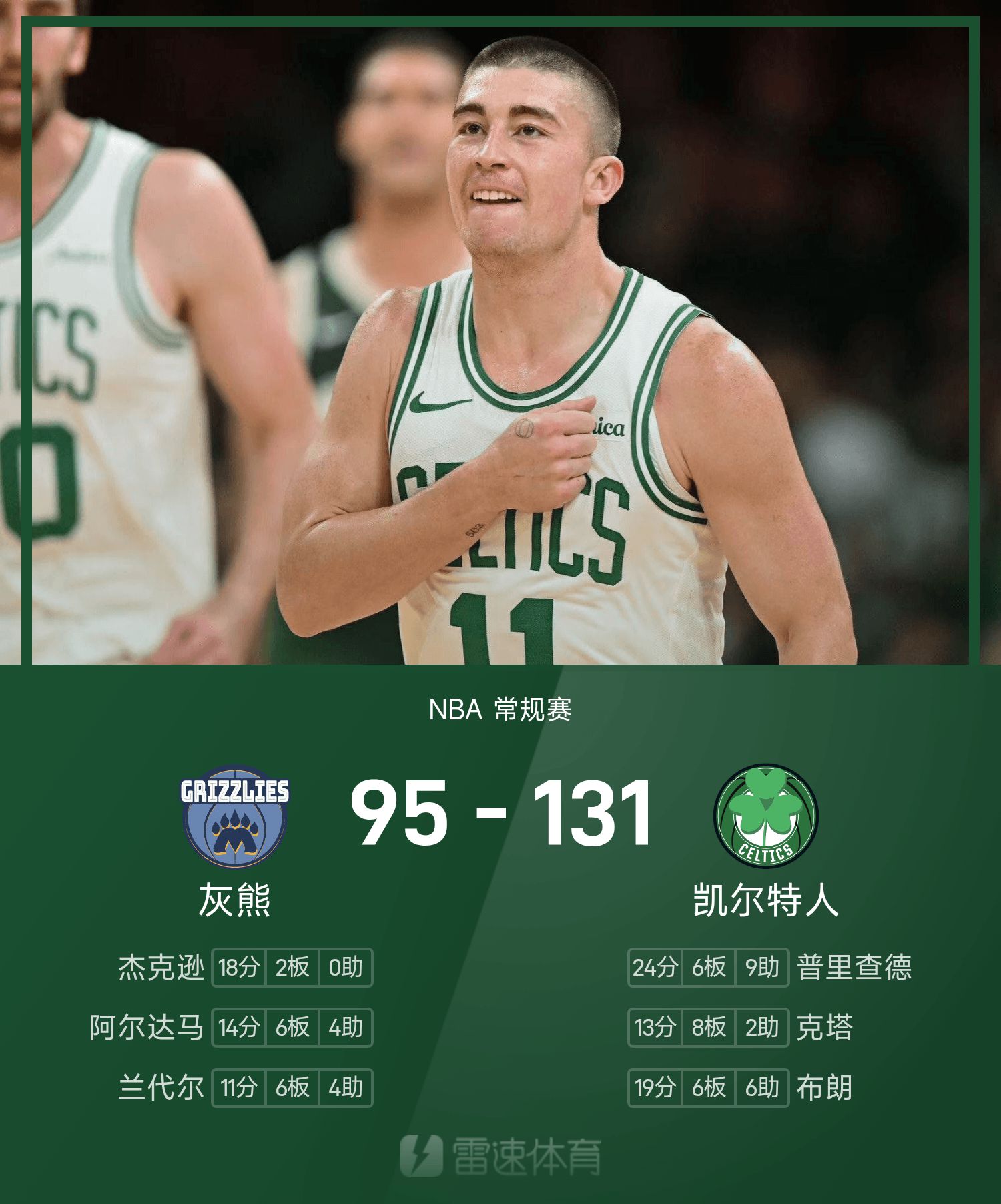 खेल के अंत में, सेल्टिक्स ने ग्रिज़लीज़ को 131-95 से हरा दिया।