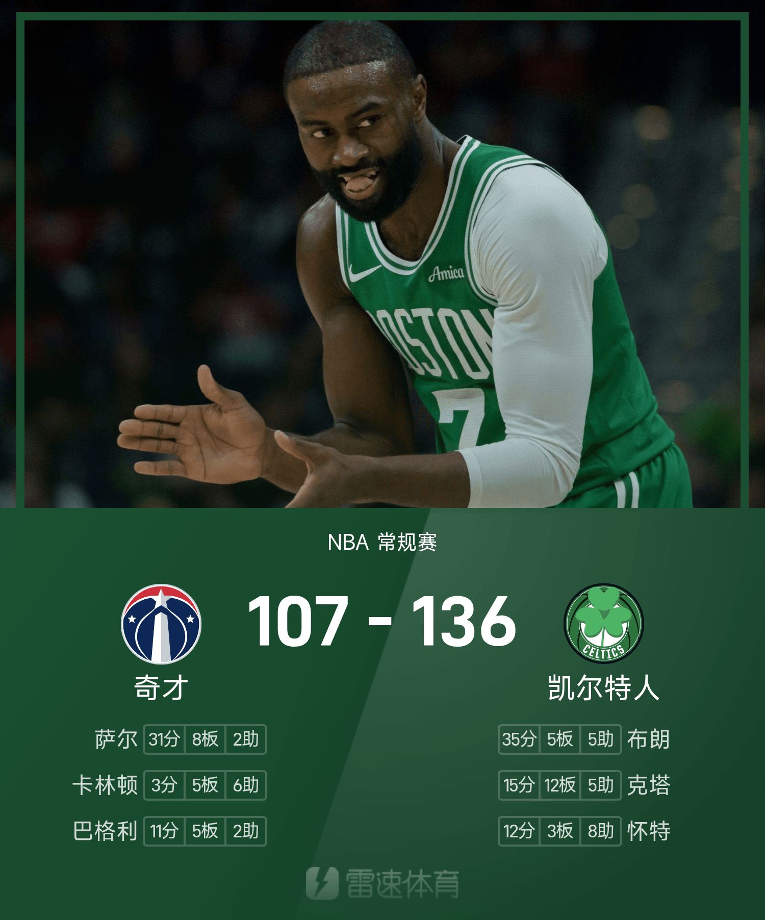 6686 खेल नवंबर 06 समाचार 25/26 NBA नियमित सीज़न में, सेल्टिक्स ने विजार्ड्स का सामना किया। खेल के अंत में, सेल्टिक्स ने विजार्ड्स को 136-107 से हराया। ब्राउन ने गेम में सर्वाधिक 35 अंक, 5 रिबाउंड और 5 सहायता अर्जित की, जिससे सेल्टिक्स को जीत मिली।